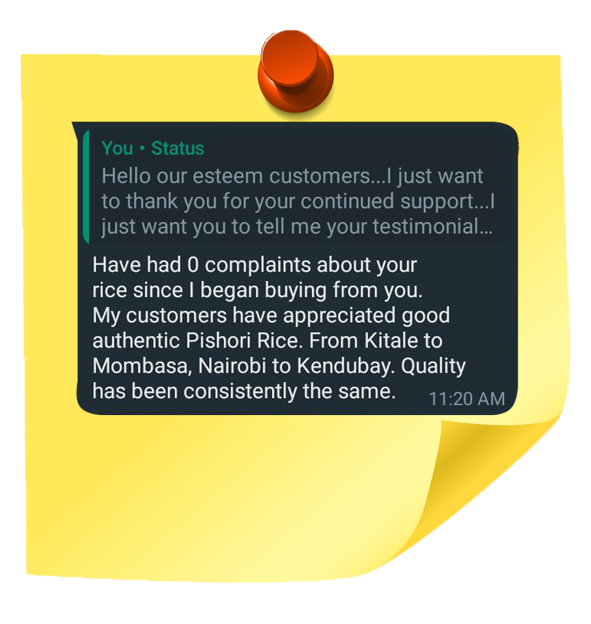 We processand market Mwea Pishori rice which is grown by our local farmers.Our Mission is to enrich rice families under the Baraka Pishori Rice Brand