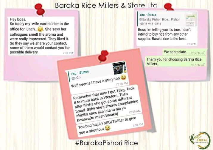 Baraka Rice Millers & store's customer service is amongest the best in the market so far. Equipped with fisrt class employees ready to serve you anytime anywhere.